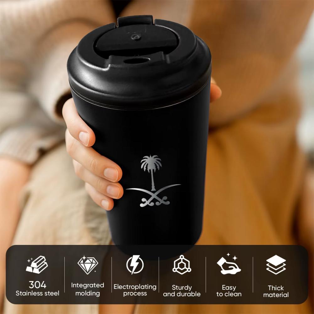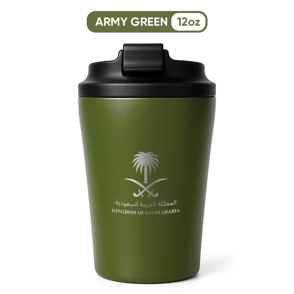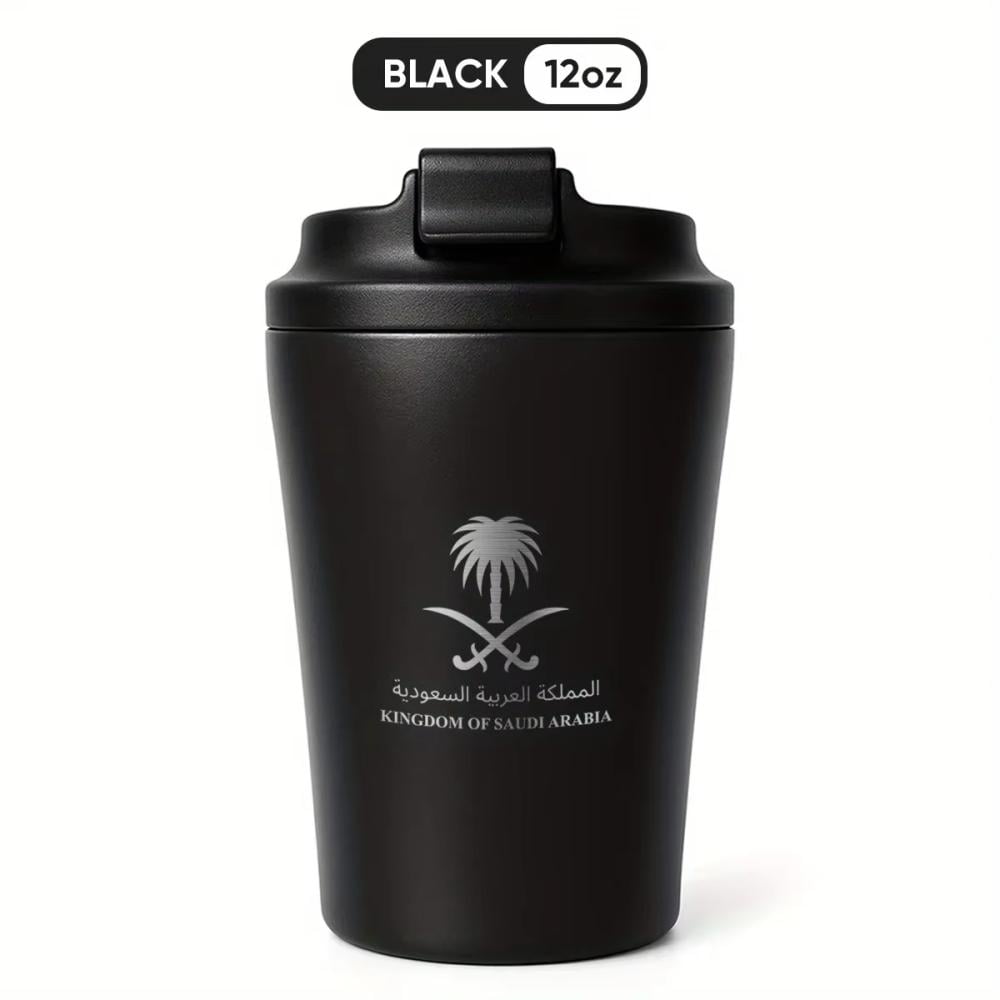 كوب عملي أنيق مصنوع من الستانلس ستيل، مزود بغطاء محكم للحفاظ على الحرارة أو البرودة. يتميز بتصميم وطني يحمل شعار المملكة، مثالي للاستخدام في التنقل أو المكتب أو أثناء التخييم.